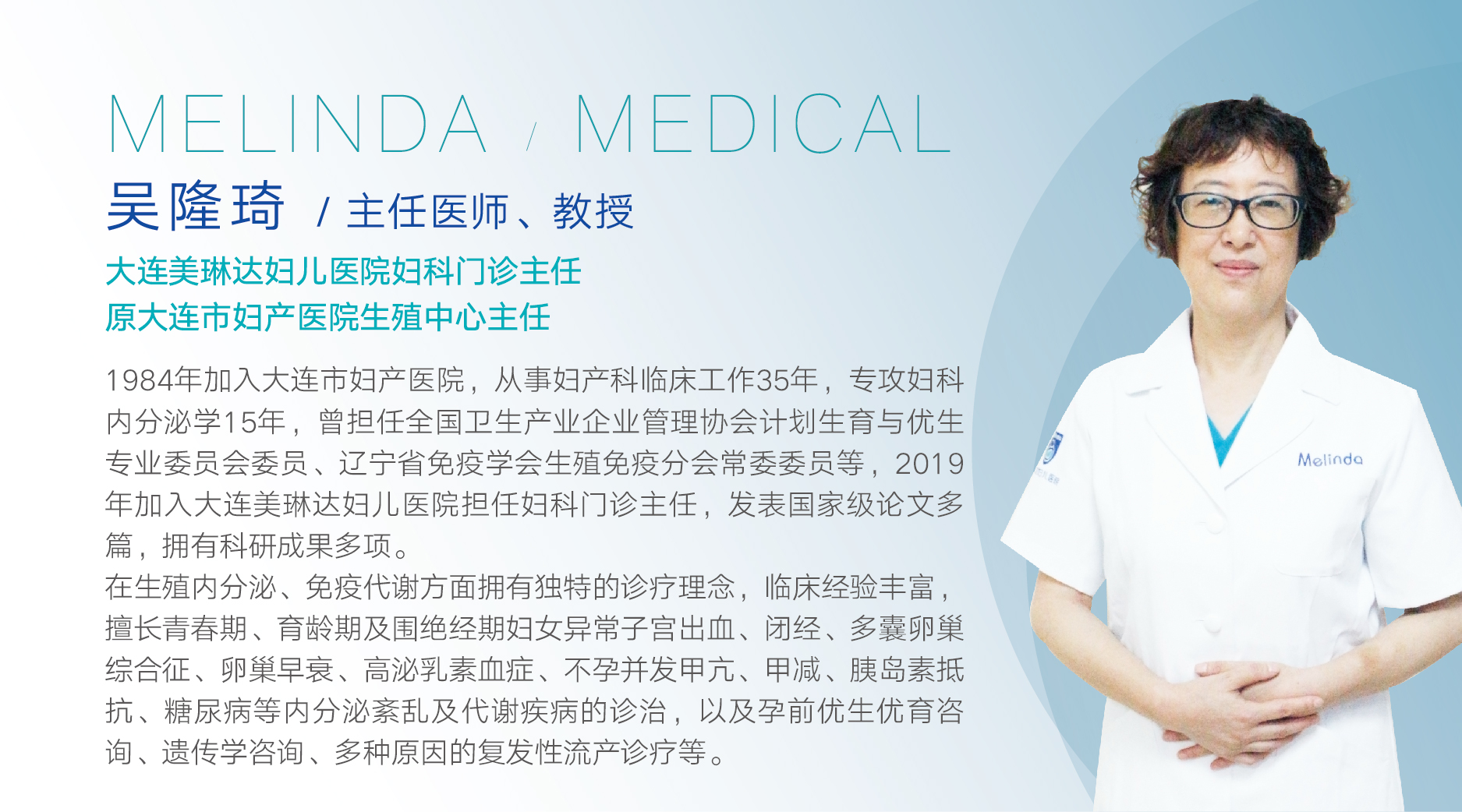 吴隆琦教授担任学科带头人,吴教授从事妇产科临床工作35年,专攻生殖医学、妇科内分泌学15年,现在是大连美琳达妇儿医院妇科门诊主任,目前,每周一至周五出诊。