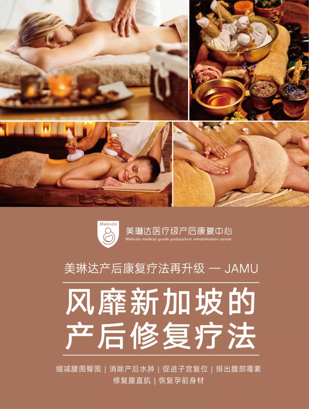 JAMU一词是马来文中“草药”的意思,JAMU产后按摩起源于17世纪前的东南亚皇室,如今已风靡至新加坡,流传了几代人,不仅可以帮助产后妈妈的身体恢复到怀孕前的状态,保持肌肉的紧实度,还能够缓解妈妈因为分娩和照顾新生儿造成的压力,找回失去的活力。